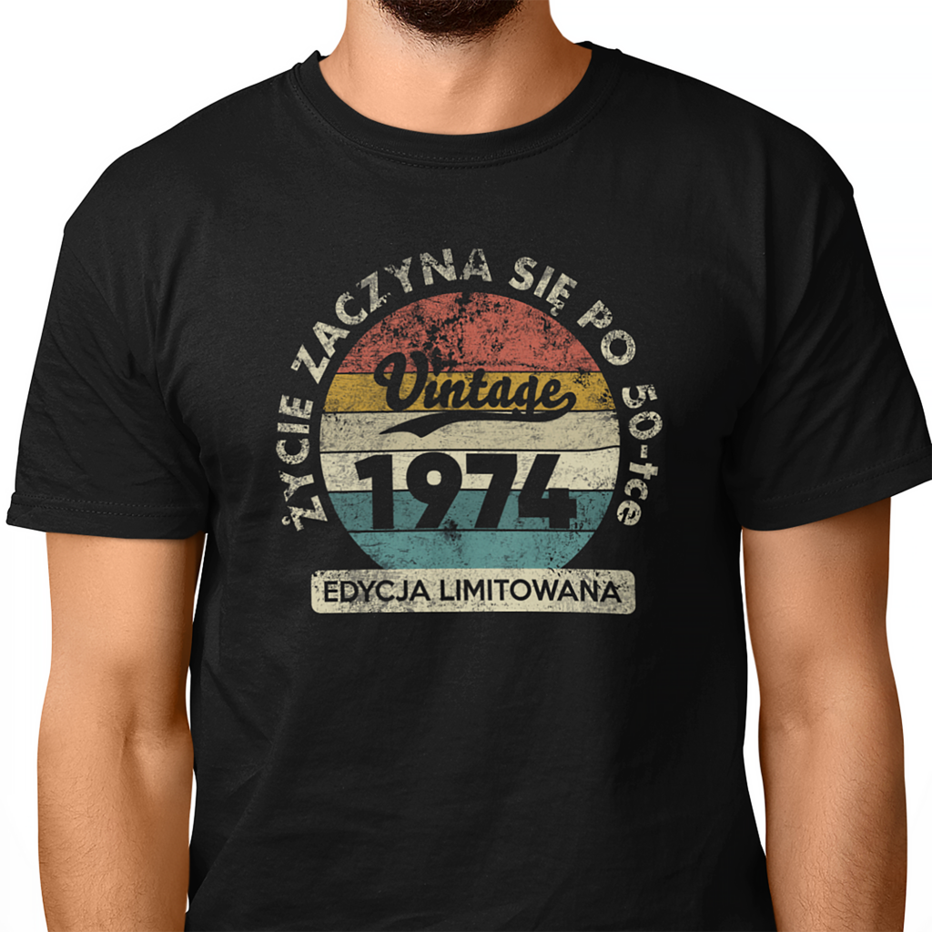 PERSONALIZOWANA KOSZULKA URODZINOWA NA 50 CZTERDZIESTKĘ URODZINY W STYLU RETRO VINTAGE 1975